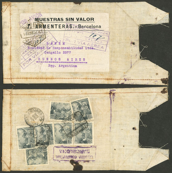 envelope that contained "SAMPLES WITHOUT VALUE", sent by registered airmail from Barcelona to Argentina on 15/MAR/1942??, franked with 7Ptas., VF quality! (Image)