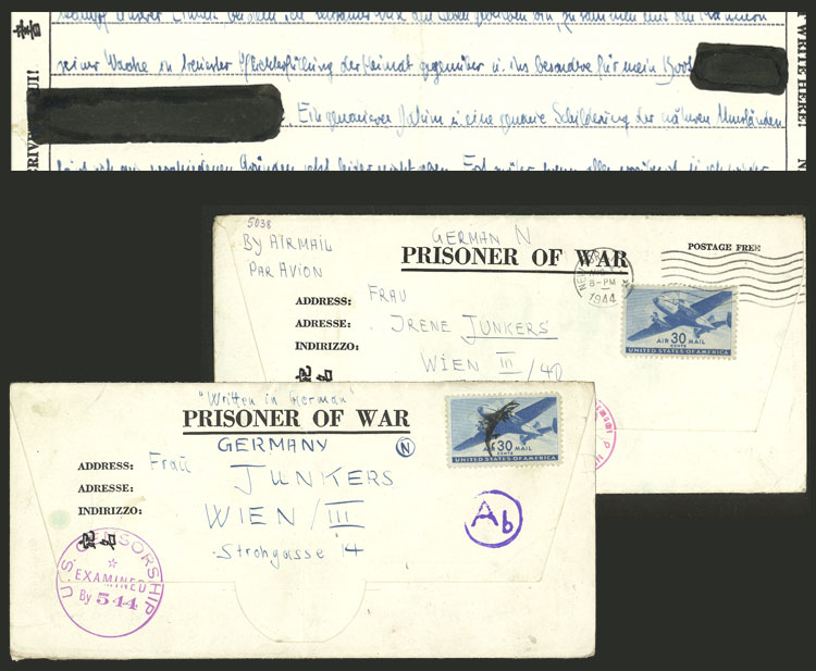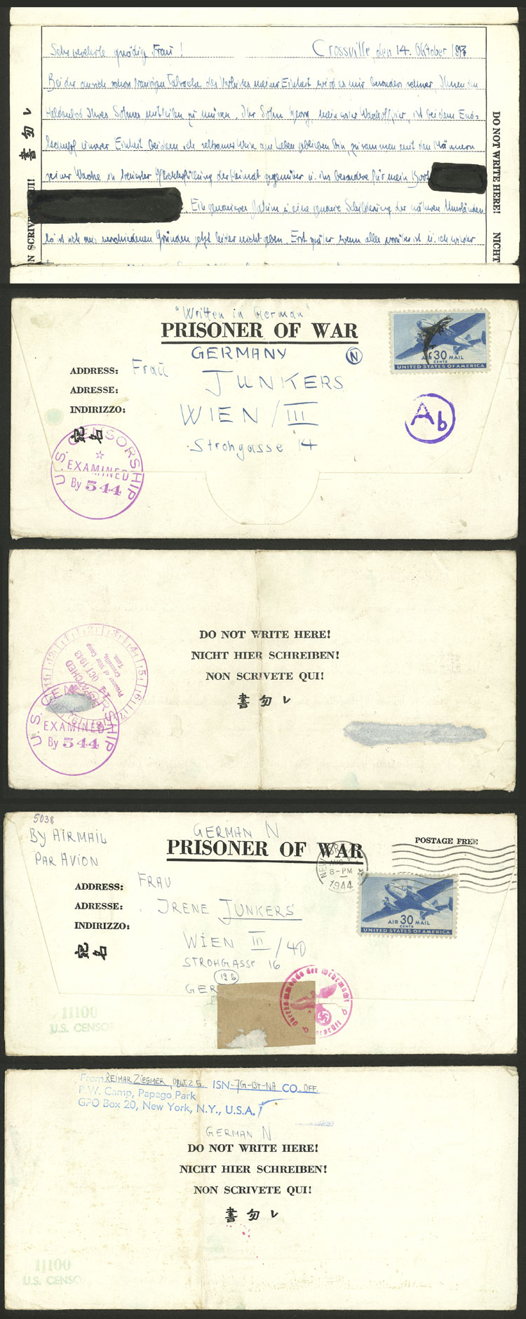 Letters of a German prisoner of war called Reimar W. Ziesmer, sent to Wien (at the time anexed by Germany) in 1943 and 1944, from the POW camps of Crossville and Papago Park, both with censor marks, and the former with part of the text censored, VF