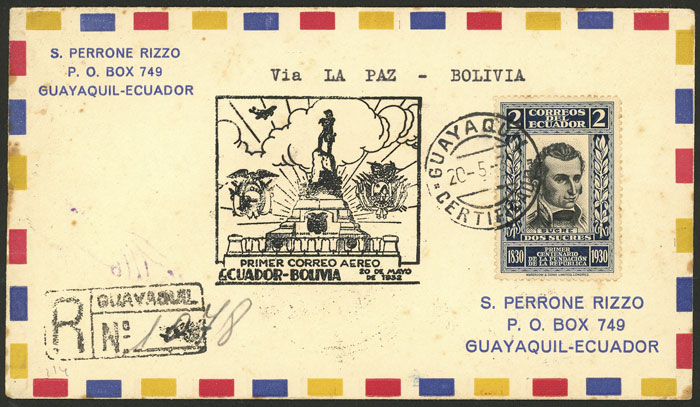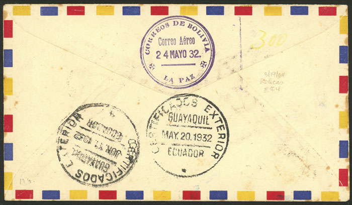 20/MAY/1932 Guayaquil - La Paz (Bolivia), first flight by PANAGRA (only 63 pieces were flown), with special handstamp and arrival backstamps, VF quality!