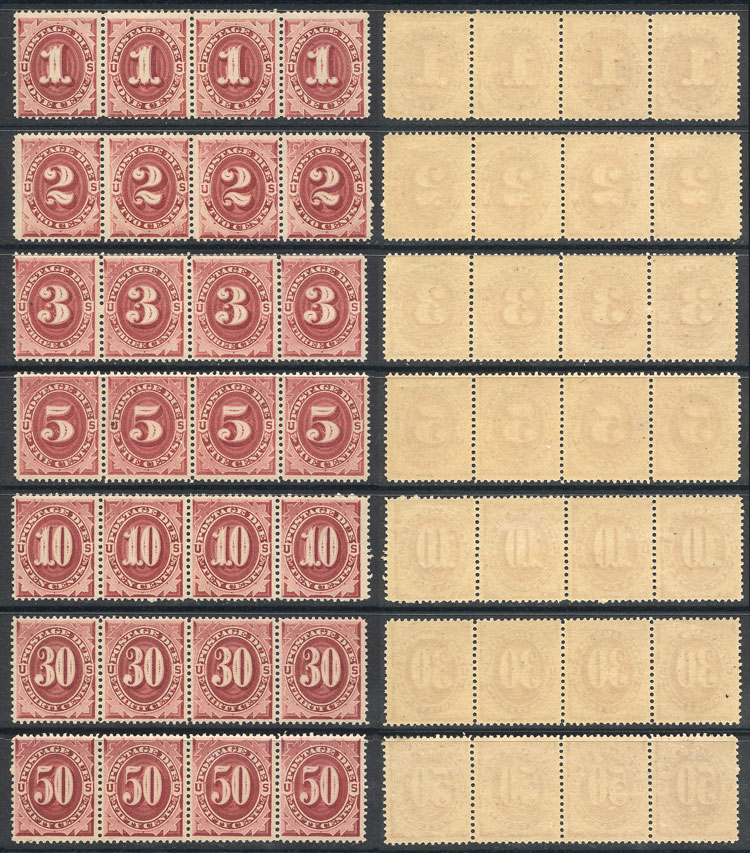 Sc.J22/J28, 1891 Complete set of 7 values in STRIPS OF 4, the stamps at the left and right ends with tiny and barely visible hinge marks, and the central stamps are unmounted perfect. Fantastic quality, the gum is as fresh as it was