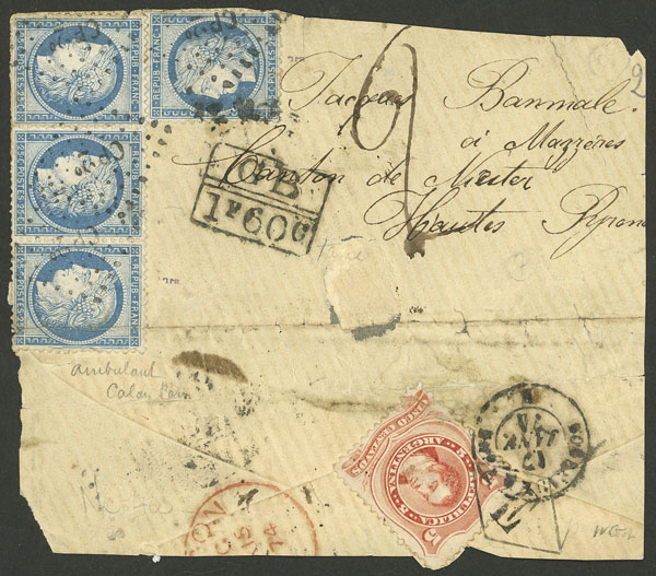 ROUTE and DOUBLE FRENCH RATE: Large fragment of cover sent from B.Aires to Mazeres (Hautes-Pyrenees) in DE/1873, dispatched from CARTERÍA "E" in Buenos Aires where it received the corresponding Argentine postage of 5c. and the French rate of 1Fr. (4x