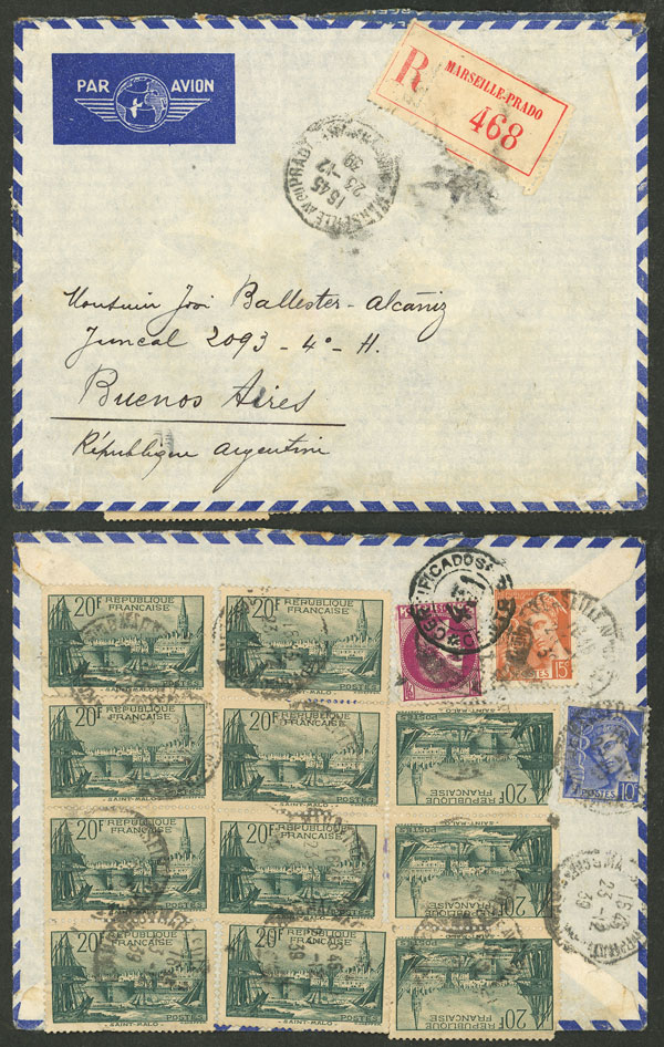 23/DE/1939 Marseille-Prado to Argentina, registered airmail cover, franked on back with 223,25Fr., with arrival mark of Buenos Aires (numeral, without date), very fine quality, spectacular! (Image)