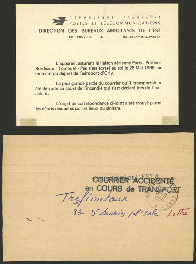 CRASH: Wrapper to St. Severin carried on the night flight of Air France of 28/MAY/1969, that crashed shortly after takeoff in the airport of Orly, the crew survived but large part of the mail was destroyed. The wrapper has a 2-line mark "COURRIER