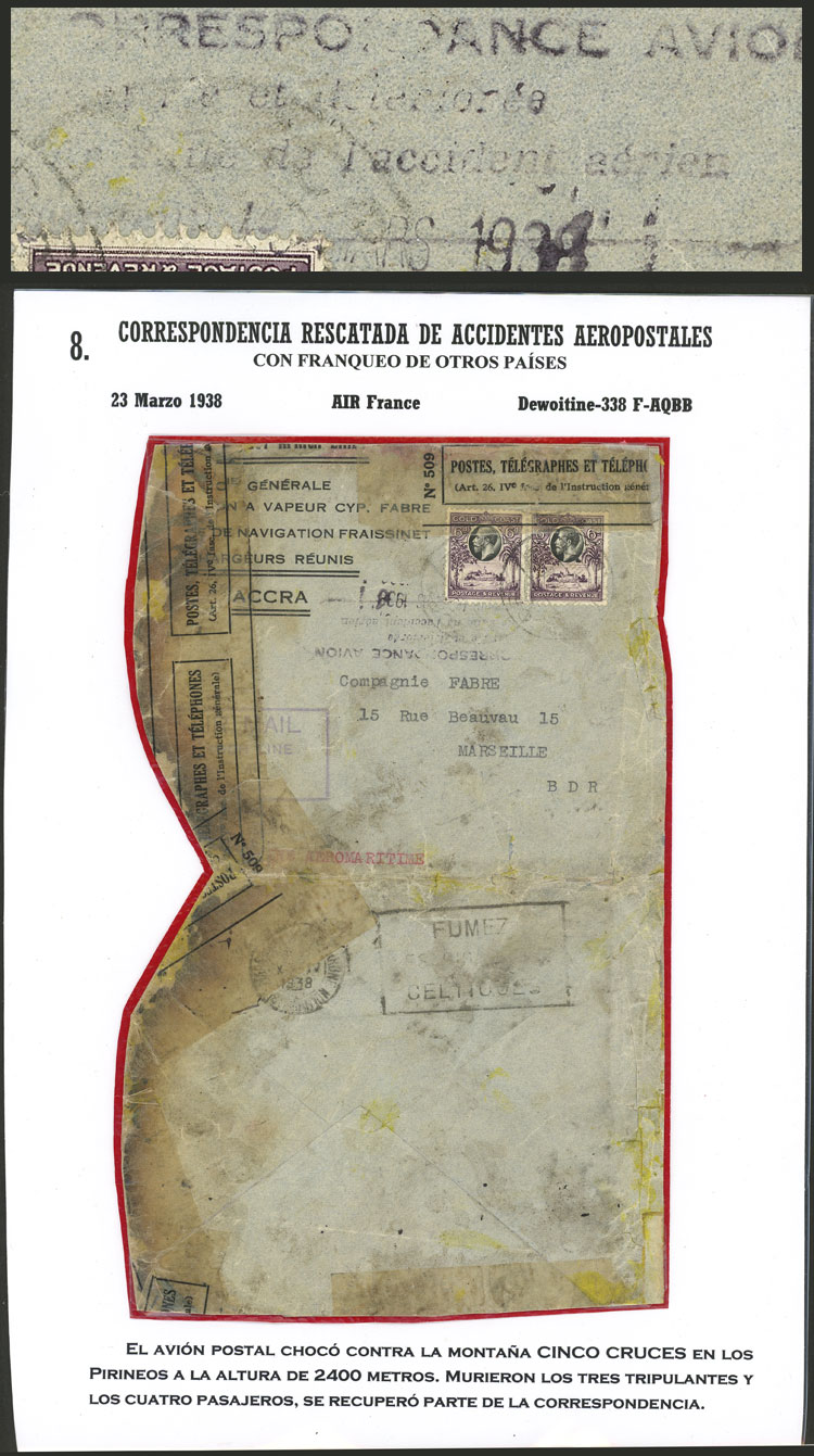 CRASH: Airmail cover sent from Accra (Gold Coast) to Marseille franked with 12p. The Air France plane crashed against a mountain in the Pyrenees on 23/MAR/1938, the crew and passengers were killed, and only part of the mail was recovered. Cover with