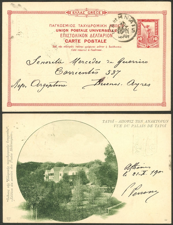 Beautiful 10l. postal card with image printed on back of "Tatoi Palace", sent from Athens to Argentina on 10/OC/1901, excellent! (Image)