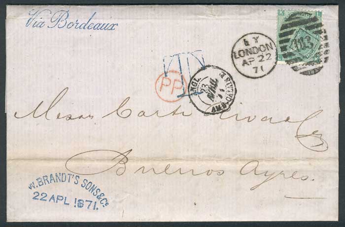 25c.) to be carried by the French mail to destination (probably by Mensageries Imperiales). For some reason, it was forwarded by the English mail office in B.Aires, and the cover arrived in London on 15/JA/1874 and from there carried to France (see