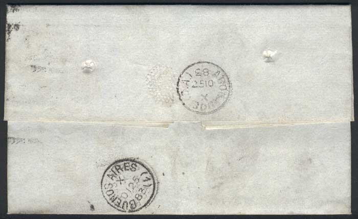 LONDON - ARGENTINA: complete folded letter franked by Sc.54 plate 4, with duplex cancel "103", sent to Buenos Aires VIA FRANCE, with transit markings and "T", excellent quality, rare! (Image)