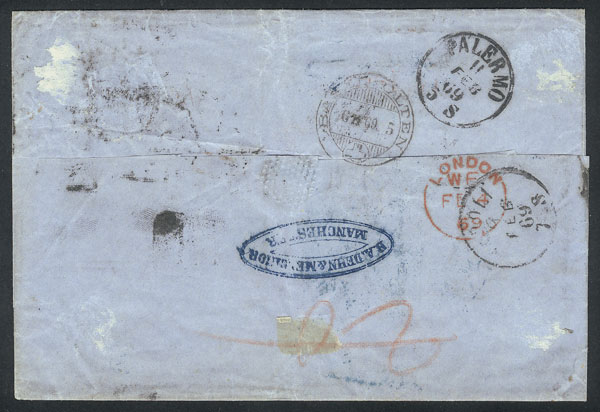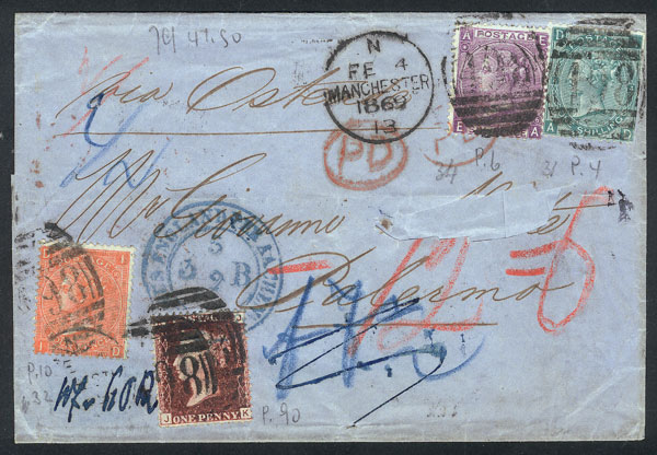 "Manchester - 498", red "PD" ovals (paid to destination), transit mark of Aachen (blue) and several manuscript inscriptions in red and blue pencil. With transit backstamps of London, Basel, Napoli, and arrival on 11/FE, very attractive and