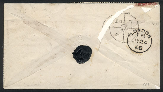 address clear), each stamp neatly cancelled by "Derry - 172" duplex, and transit backstamp of London. A very attractive cover carried by the Union Steamship Company at the inauguracion of the 3rd contract period in July 1868. NOTE: the previous owner