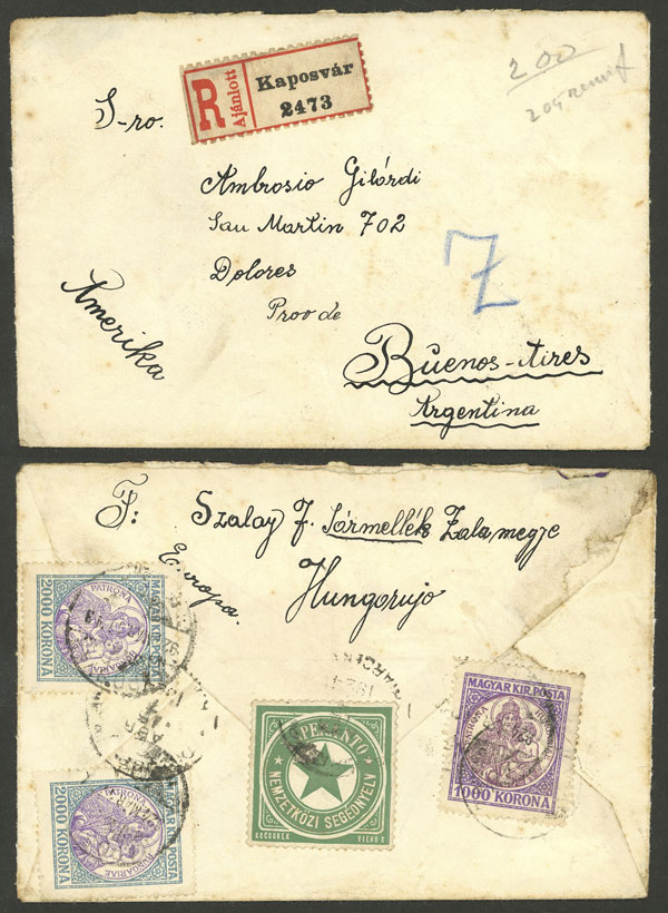 15/MAR/1924 KAPOSVAR - Argentina, registered cover with attractive 5000k. franking on back, it also bears a nice "ESPERANTO" cinderella, with arrival cancels of 15/AP, VF quality! (Image)