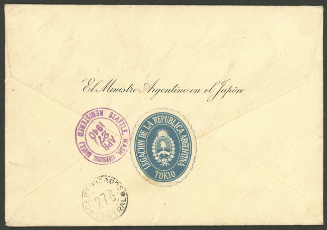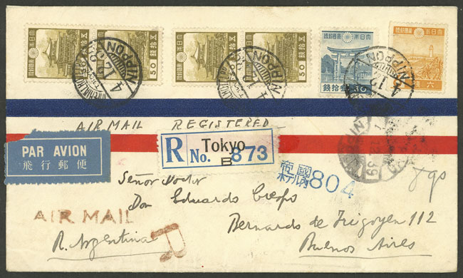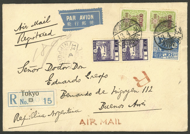Registered airmail cover sent from Tokyo to Argentina on 13/AP/1940, handsome postage with datestamp of "IMPERIAL HOTEL PO - TOKYO", on back transit mark of San Francisco 27/AP and B.Aires arrival, VF! (Image) (Image-02)
