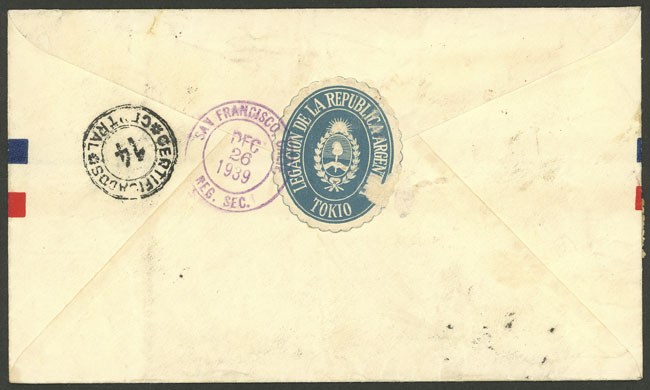 Registered airmail cover sent from Tokyo to Argentina on 4/DE/1939, beautiful postage with datestamp of "IMPERIAL HOTEL PO - TOKYO", on back transit mark of San Francisco 26/DE and B.Aires arrival, VF! (Image) (Image-02)