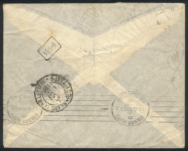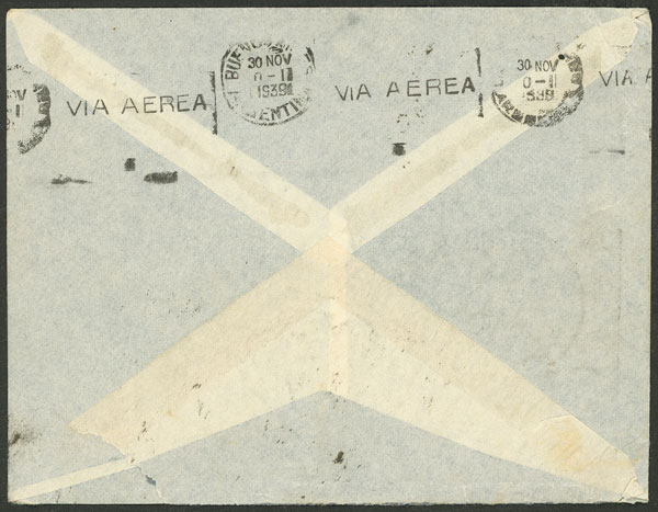 Cover flown by ZEPPELIN, sent from Milano to Buenos Aires on 5/MAY/1933, with transit mark of Friedrichshafen 6/MAY, special handstamp for the flight in blue, and arrival backstamp of 11/MAY, light vertical crease in the middle, else