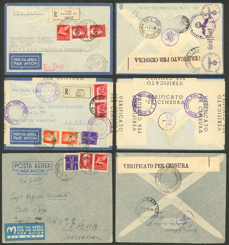Airmail covers (2 registered) sent from Roma to Argentina in 1941, BY LATI, franked with 13L., 14L. and 14,50L., all with attractive censor labels and varied marks, in general of very fine quality! IMPORTANT: Please view ALL the photos of the lot,