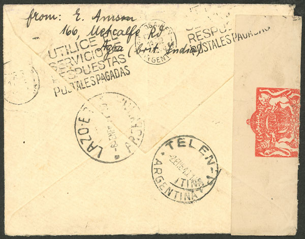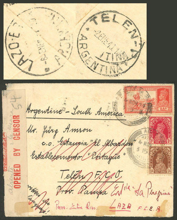 RARE DESTINATION: Airmail cover sent from Agra to Argentina 4/NO/1939: First to Telén (La Pampa) and from there it was forwarded to Laza (Entre Ríos), with a nice censor label and on back the rare marks of TELEN (2/JA/1949) and LAZA