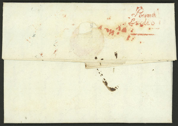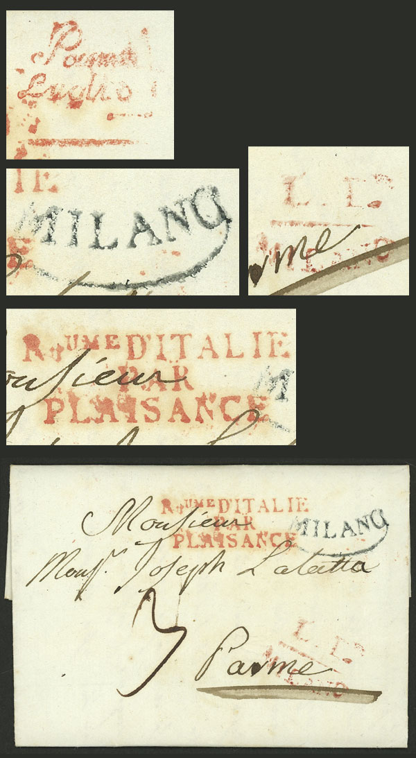 Entire letter dated Milano 19/JUL/1808 and sent to Parma, with the marks "MILANO" with semi-circle below, black + "L.L. - MILANO" and "Rume. D´ITALIE - PAR - PLAISANCE" + arrival backstamps, all in red, excellent quality! (Image) (Image-02)