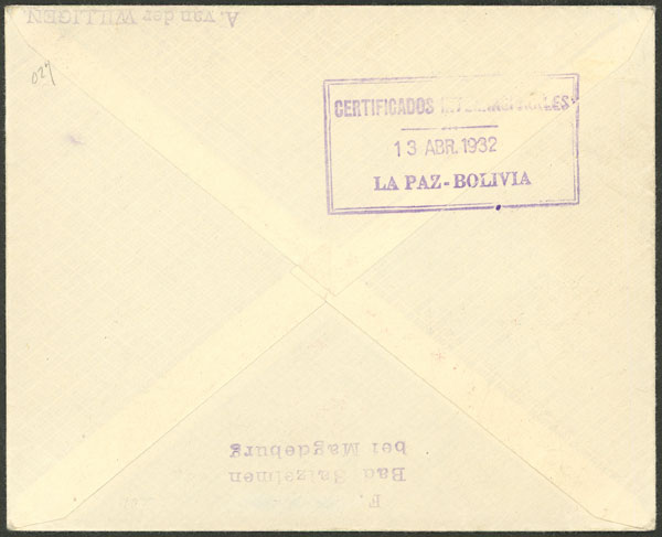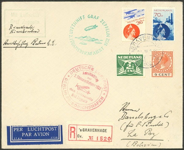 Registered cover sent from The Hague to Bolivia by Zeppelin on 21/MAR/1932 on the 2nd flight to South America of that year, with special handstamps and arrival backstamp of La Paz 13/AP, excellent quality, rare destination! (Image) (Image-02)