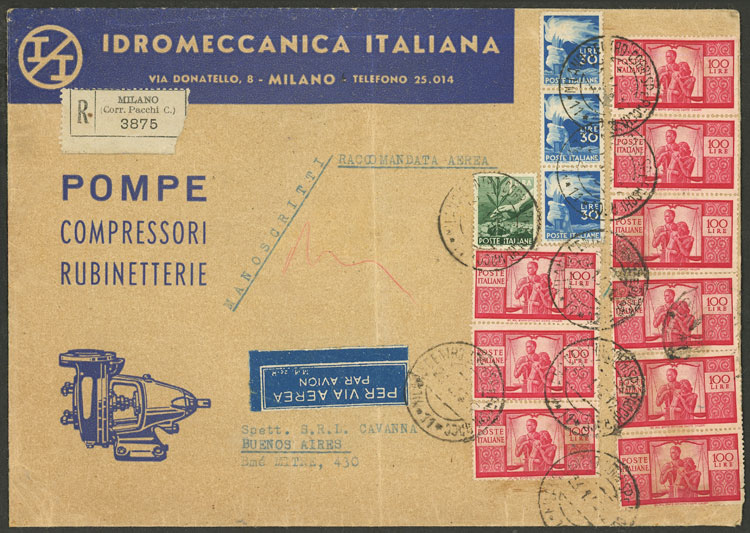 23/JA/1948 Milano to Argentina, registered airmail cover, spectacular postage of 991L., very fine quality! (Image) (Image-02)