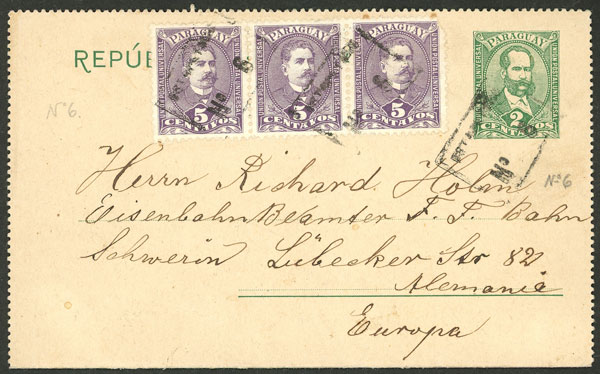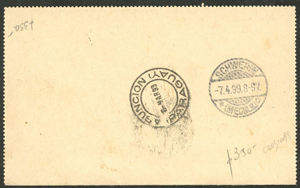 5/MAR/1899 SAPUCAY to Germany, 2c. lettercard + additional 15c. (total 17c.), with rectangular cancels "ESTAFETERO Nº6" and on back transit mark of Asunción and arrival, excellent quality, rare, ex-Loeb (its price was US$350) (Image) (Image-02)