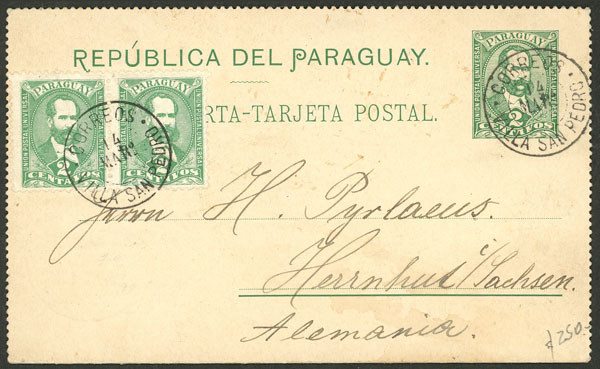 2c. Lettercard + additional 4c., dated "Nueva Germania 11/MAR/1897" and postmarks of "VILLA SAN PEDRO - 14/MAR", on back transit mark of Asunción and arrival, VF quality, ex-Loeb (its price was US$250) (Image) (Image-02)