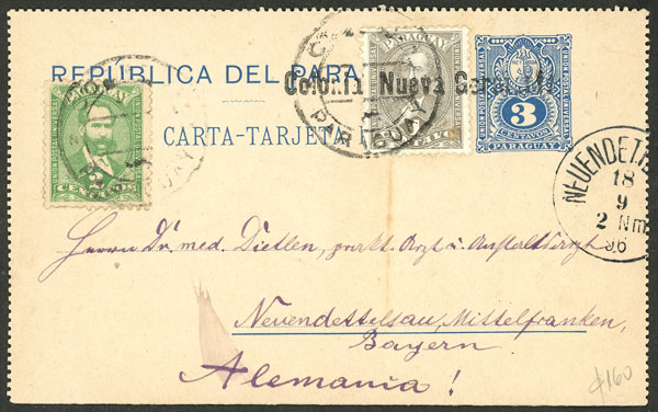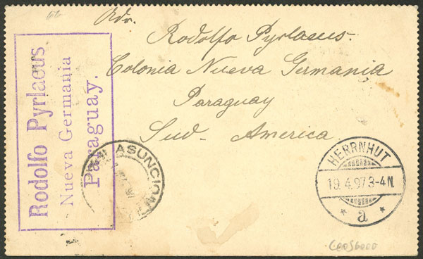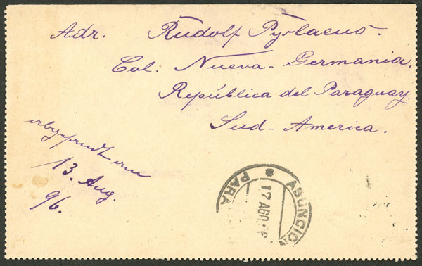 3c. Lettercard + additional 3c., sent from COLONIA NUEVA GERMANIA to Germany in AU/1896, with transit mark of Asunción 17/AU and arrival, VF quality, ex-Loeb (its price was US$160) (Image) (Image-02)