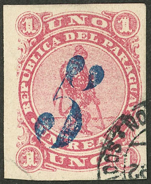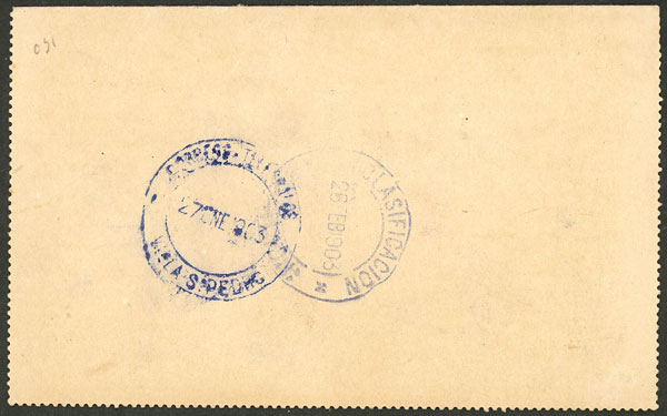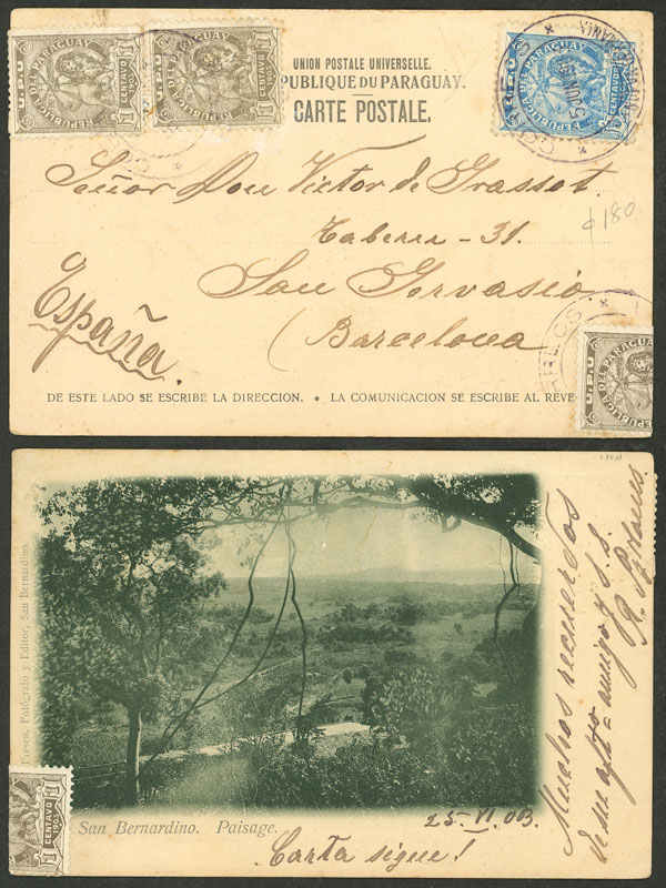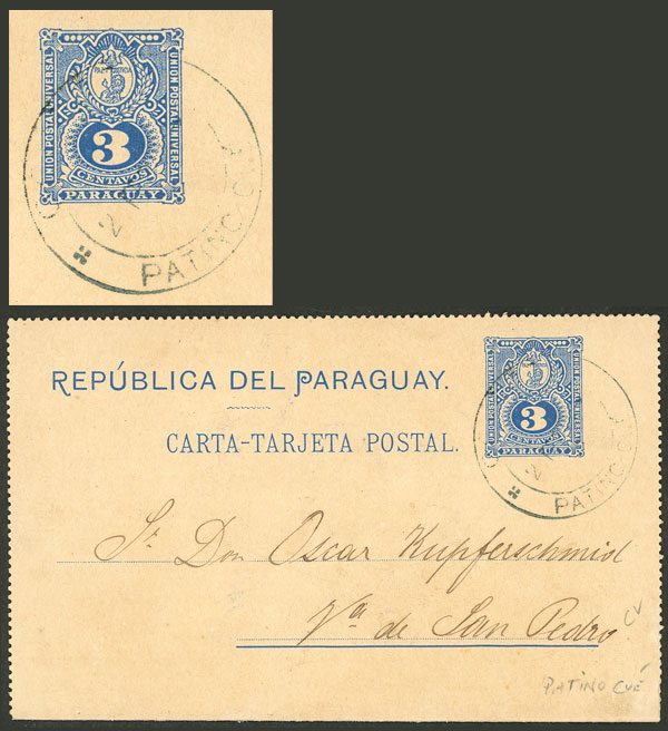 3c. Lettercard dated "San Bernardino 25/FE/1903" and cancelled "PATINO CUÉ", sent to Villa de San Pedro, on back it bears transit mark of Asunción 26/FE and arrival for the following day, VF quality, rare mark! Ex-Loeb (its price was