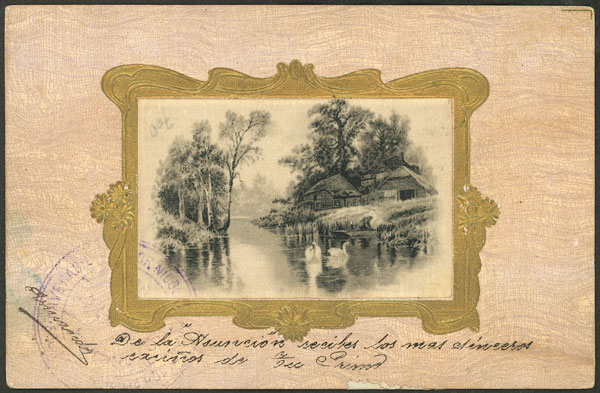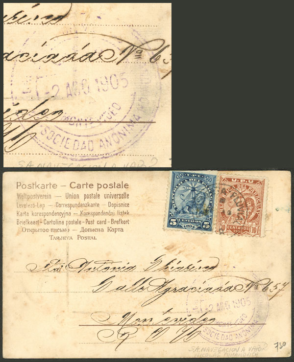 RIVER TRAVELING PO: Postcard sent from Asunción to Montevideo on 2/AP/1905 franked with 15c., postmarked "ESTAFETA FLUVIAL", and with violet mark "NAVEGACION A VAPOR - NICOLAS MIHANOVOCH - MONTEVIDEO - SOCIEDAD ANONIMA", VF and very rare.