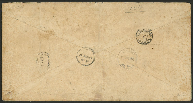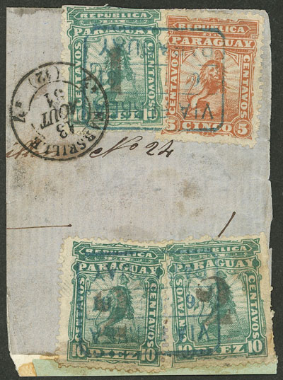 17 + 18 x2 franking a large fragment of a cover sent to France, with rectangular cancels "VIA FERREA", and datestamp of Marseille 13/AU/1881, VF quality, very rare, ex-Loeb (its price was US$590) (Image)