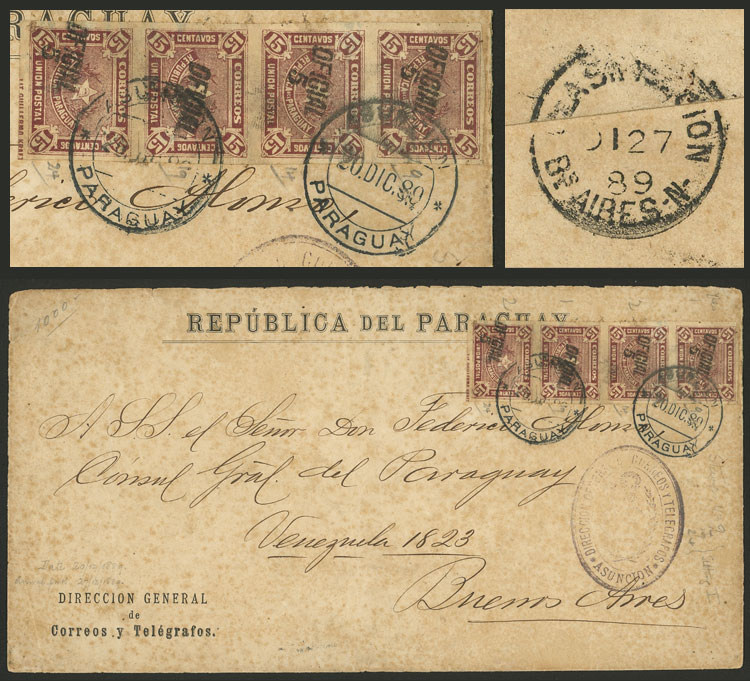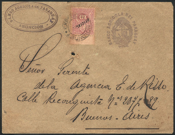 Official cover of the Banco Agrícola del Paraguay, franked with official stamp of 10c. lilac, sent to Buenos Aires in APR/1897 (arrival backstamp). Genuinely used official covers of Paraguay are very rare, with official stamps used