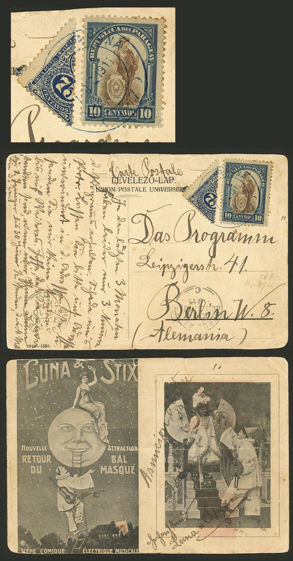 Beautiful PC dated Asunción 26/DE/1911, franked with 30c. with blue cancel "ESTAFETA DEL PARANA (Nº7)" for 27/DE, sent to Berlin, transit mark of Buenos Aires, VF quality, rare! (Image)