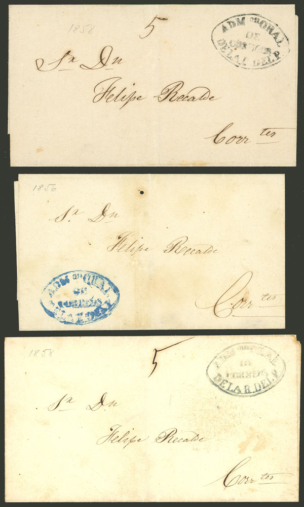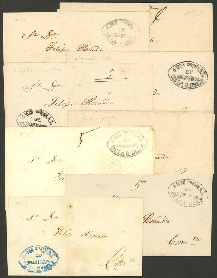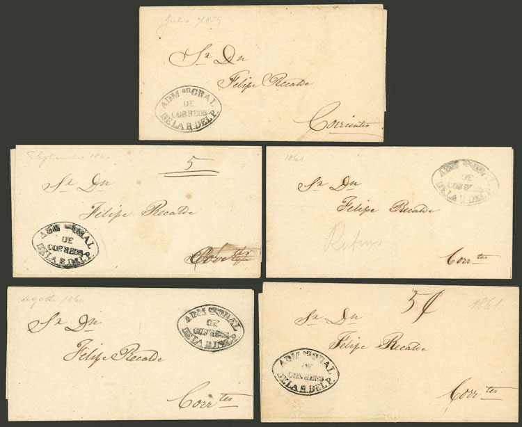 Folded covers sent to Corrientes between 1856 and 1861, all with the mark "ADM GRAL DE CORREOS DE LA R. DEL P." well applied in colors from blue (very rare!) to intense black, including gray, greenish gray etc.. several with "4" rating in pen, others