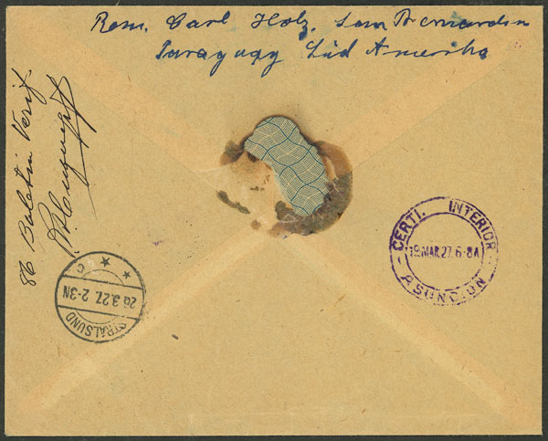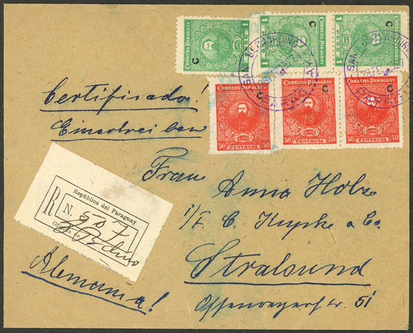 28/FEB/1927 SAN BERNARDINO to Germany, registered cover franked with 1.53P., on back transit mark of Asunción 19/MAR and arrival of Stralsund 26/MAR, very fine quality! (Image) (Image-02)