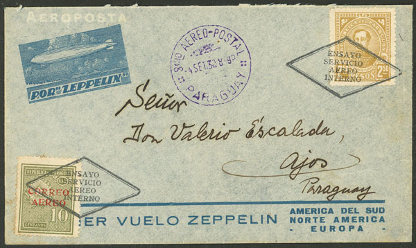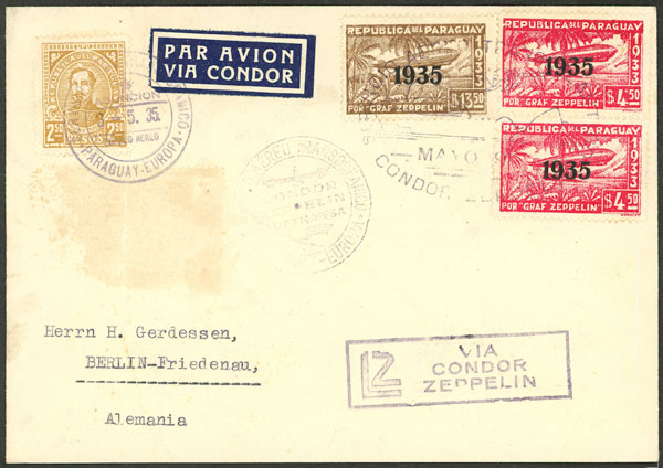 3/MAY/1935 Asunción - Germany, cover sent by Zeppelin with special franking and handstamps, VF quality, ex-Loeb (its price was US$150) (Image) (Image-02)