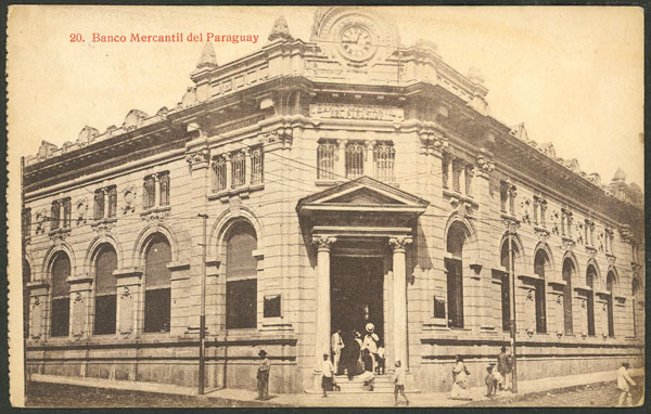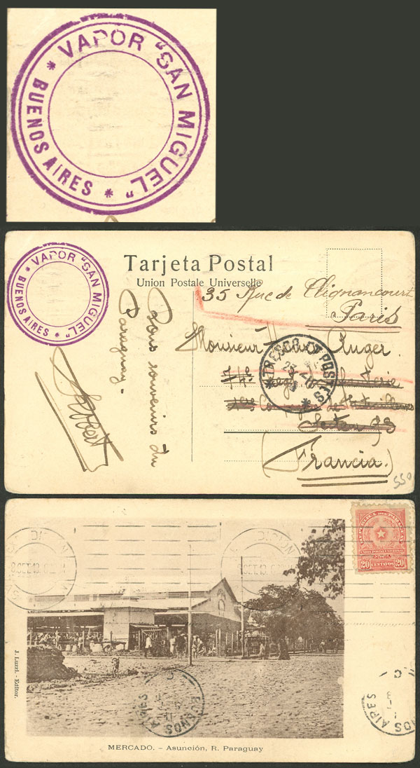 with view of market place of Asunción, franked with 20c. and sent to France on 8/SE/1918. It was carried to Buenos Aires on steamship "SAN MIGUEL" (arrival on 11/SE), reaching France on 23/OC, very fine quality, rare. Ex-Loeb (its price was US$550) (Image)