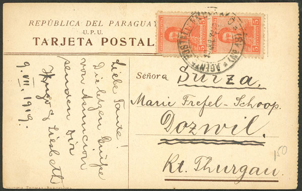 Postcard sent from Asunción to Switzerland on 9/JUL/1919, it was dispatched on an Argentine ship franked with 10c. and cancelled "AGENTE POSTAL EMBARCADO Nº18", rare, ex-Loeb (its price was US$150) (Image) (Image-02)