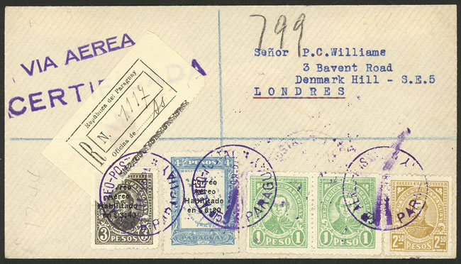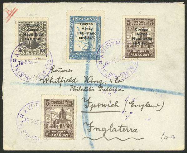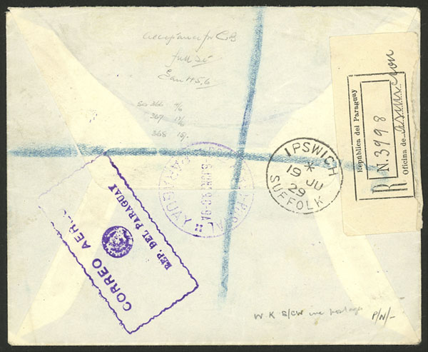 6/JUN/1929 Asunción to England, registered airmail cover flown by C.G.A. via Toulouse, on back arrival mark of Ipswich 19/JUN, excellent quality!
