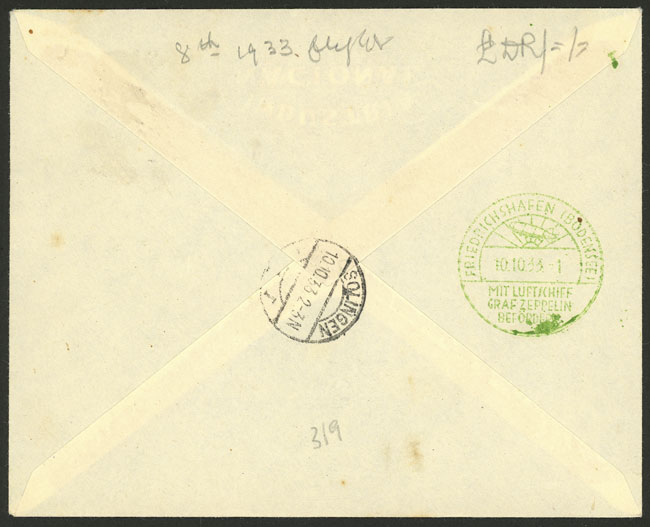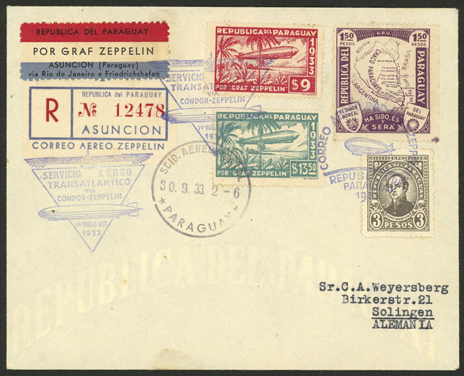 30/SE/1933 Asunción to Germany, registered airmail cover sent by ZEPPELIN, with label and special handstamps of the flight, transit and arrival backstamps, excellent quality! (Image) (Image-02)