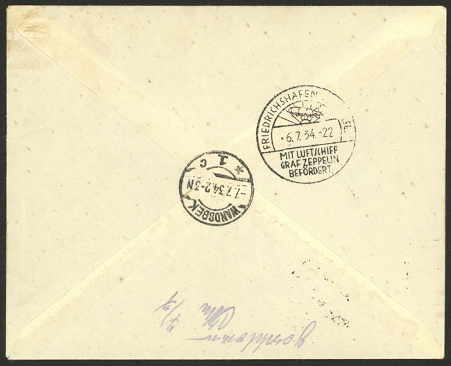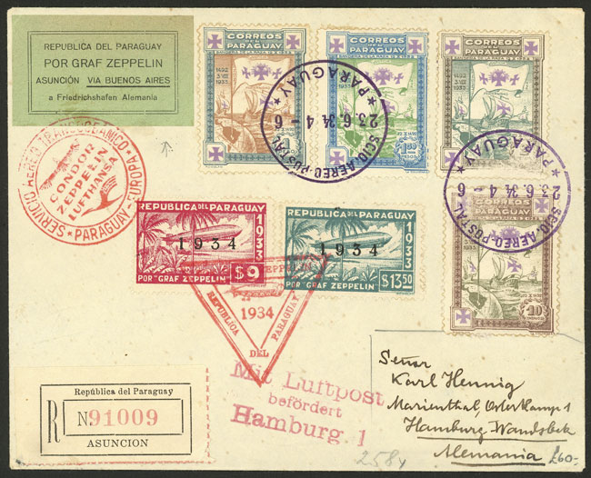 23/JUN/1934 Asunción to Germany, registered airmail cover sent by ZEPPELIN, with label and special handstamps of the flight, transit and arrival backstamps, excellent quality! (Image) (Image-02)