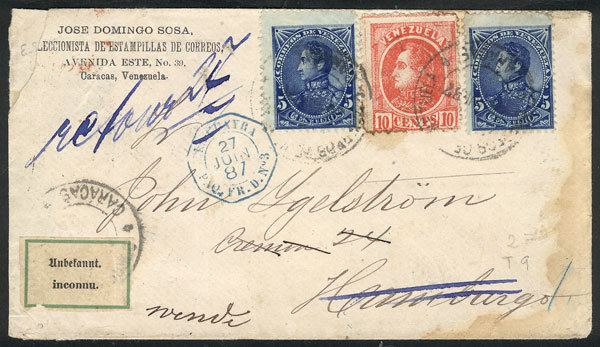 27/JUN/1887 Caracas - Hamburg - Caracas: Cover RETURNED to sender franked by Sc.69 + 74 x2, by French paquebot, VF! (Image) (Image-02)
