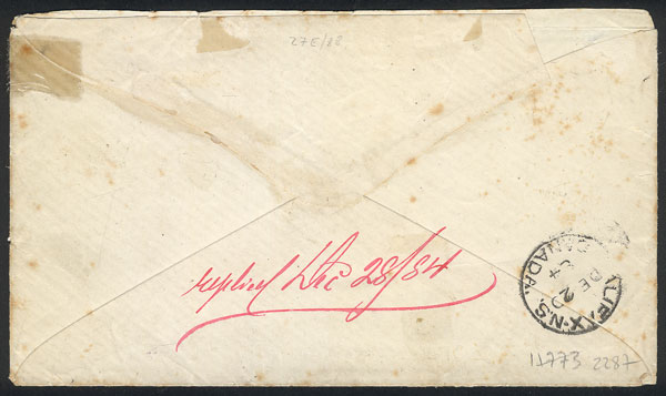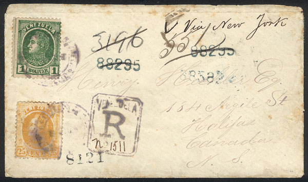 2/DE/1884 Puerto Cabello - Halifax (Canada): Registered cover franked by Sc.71 + 73 (total postage 1.25Bs.), VF, rare, catalog value US$2,000+