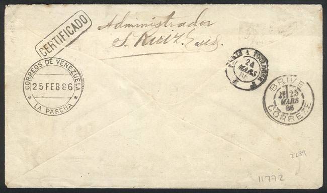 25/FE/1886 La Pascua - France: Cover franked by Sc.76 (strip of 3 + 1, total postage 1B.), many markings, VF quality! (Image) (Image-02)