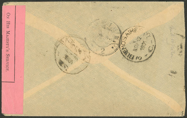 RARE DESTINATION: Cover sent from Johannesburg to Argentina on 20/SE/1901 franked with 2½p., attractive censor label and light oval mark over the postage, also arrival mark of San Juan 14/NO. On back there are other transit marks, etc.,