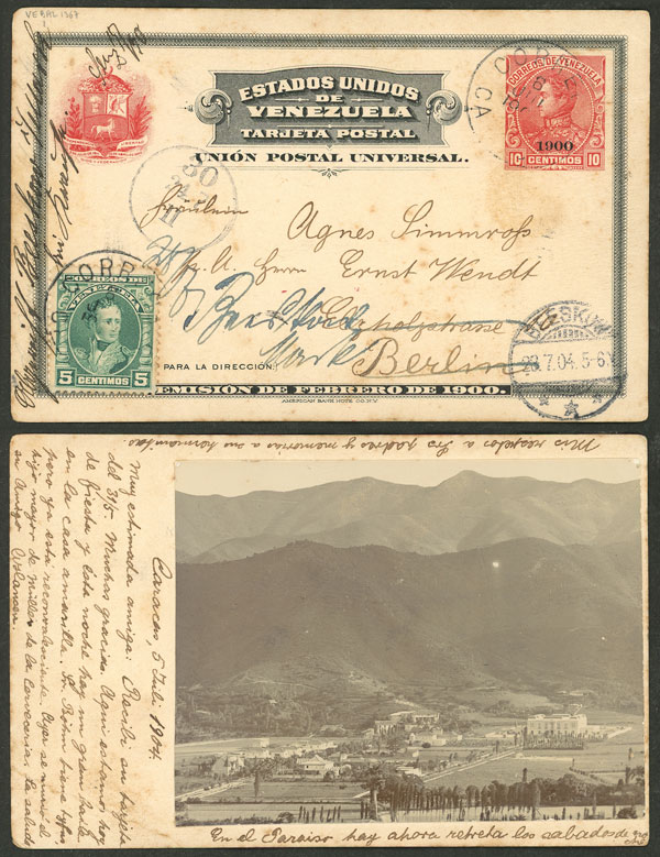 Postal card with PHOTOGRAPH AFFIXED ON BACK, with additional postage of 5c. and sent to Germany on 6/JUL/1904, arrival mark of Beeskow (28/JUL), VF and rare!
