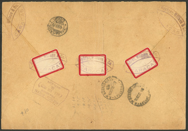 Registered cover sent from Caracas to Argentina in SE/1929 franked with 1,40Bs. endorsed "s/s Magdalena, vía Trinidad". On back there are transit marks of Colón (23/SE), Valparaiso (8/OC) and Buenos Aires arrival of 12/OC, with a crease