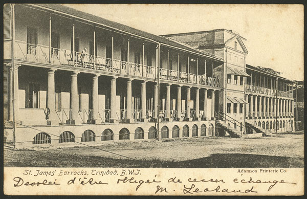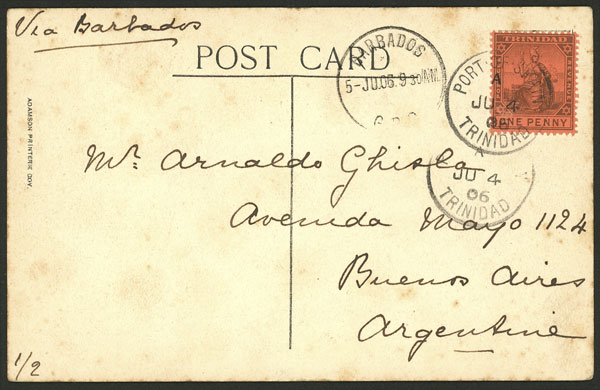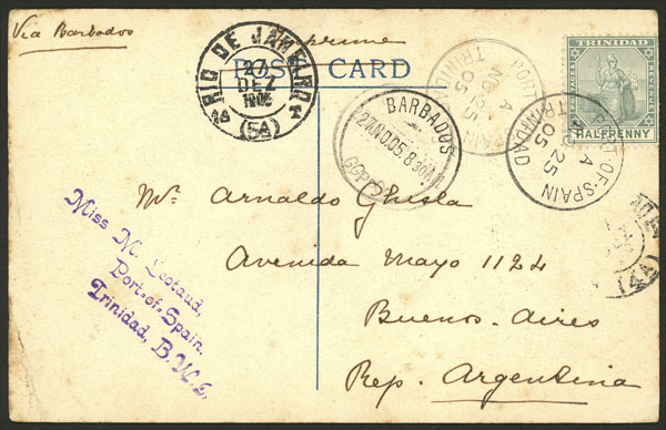 25/NO/1905 Port of Spain to Argentina, postcard franked with ½p., transit marks of Barbados 27/NO and Rio de Janeiro 27/DE, very fine quality, rare destination! (Image) (Image-02)