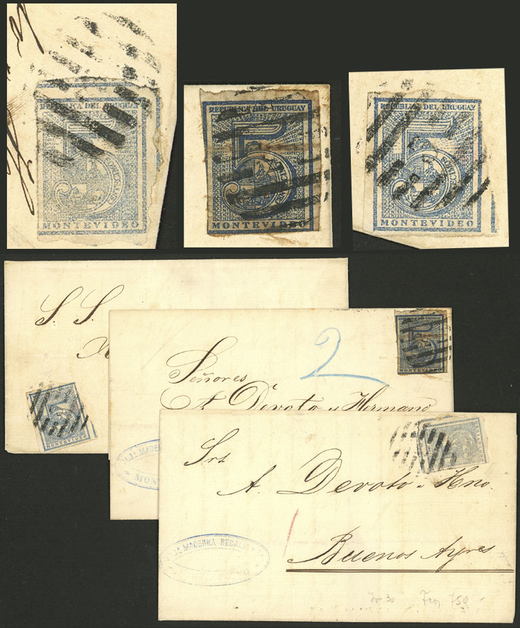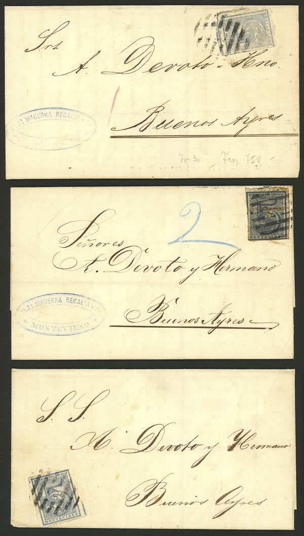 Yvert 30, 1866 Figures 5c. blue imperforate, 3 stamps in VERY DIFFERENT SHADES franking 3 folded covers sent to Argentina (circa 1870), VF quality!