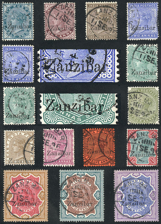 (without 8 and 12), 1896/6 13 Values of the set of 15 (missing the values 3a. orange and 1r. gray), INCLUDING VARIETIES of Sc.6 y 7: the 2a. ultramarine with 2 different types of overprint, and one 2a.6p. value with "taller Z" variety, excellent