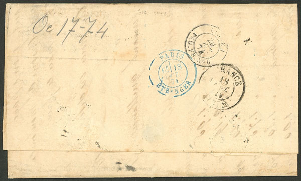 Folded cover sent from Anvers to Argentina on 17/OC/1874 franked with 3Fr. (Sc.36 strip of 3) by French paquebot, with varied marks of exchange, transit, etc. on front and back, excellent quality! (Image) (Image-02)
