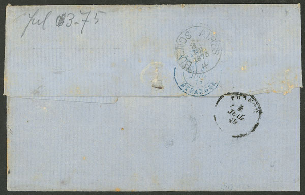 Folded cover sent from Anvers to Argentina on 3/JUL/1875 franked with 2Fr. (Sc.36 in pair), by French paquebot, with several marks on front and back (transit + Buenos Aires arrival of 31/JUL), excellent quality! (Image) (Image-02)