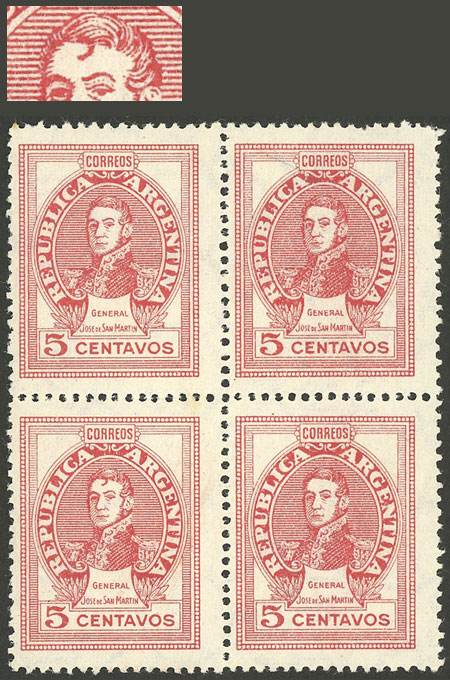 5c. San Martín, block of 4, one with variety: Curl over the forehead, VF (Image)